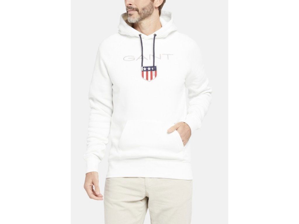 Bílá mikina s kapucí a klokankou, vyšité logo.