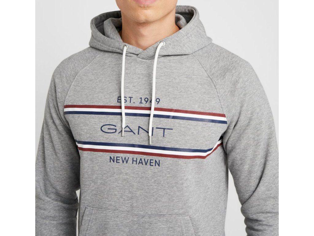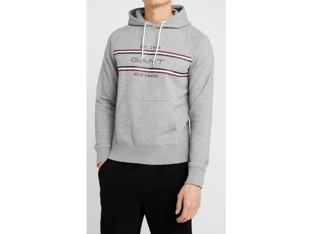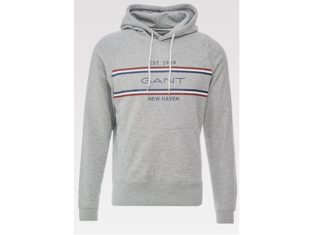 Šedá mikina s kapucí, a klokankou. Potisk logo. Rozměr 3XL: šířka 62,5cm, délka 72cm