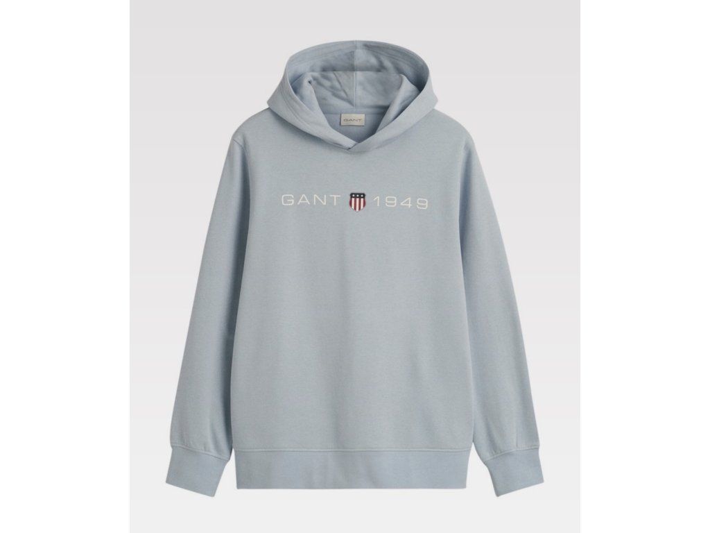 Světle modrá mikina s kapucí, bez klokanky. Potisk logo.