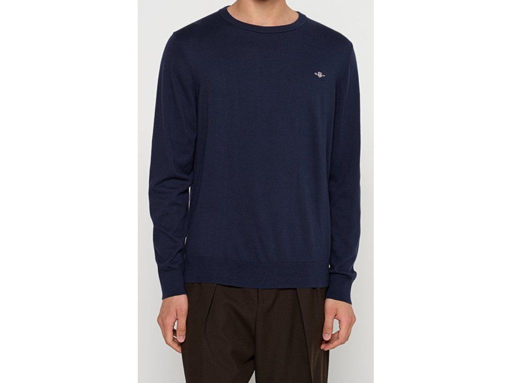 Modrý (marine) svetr, kulatý výstřih, malé vyšité logo, 100% bavlna.