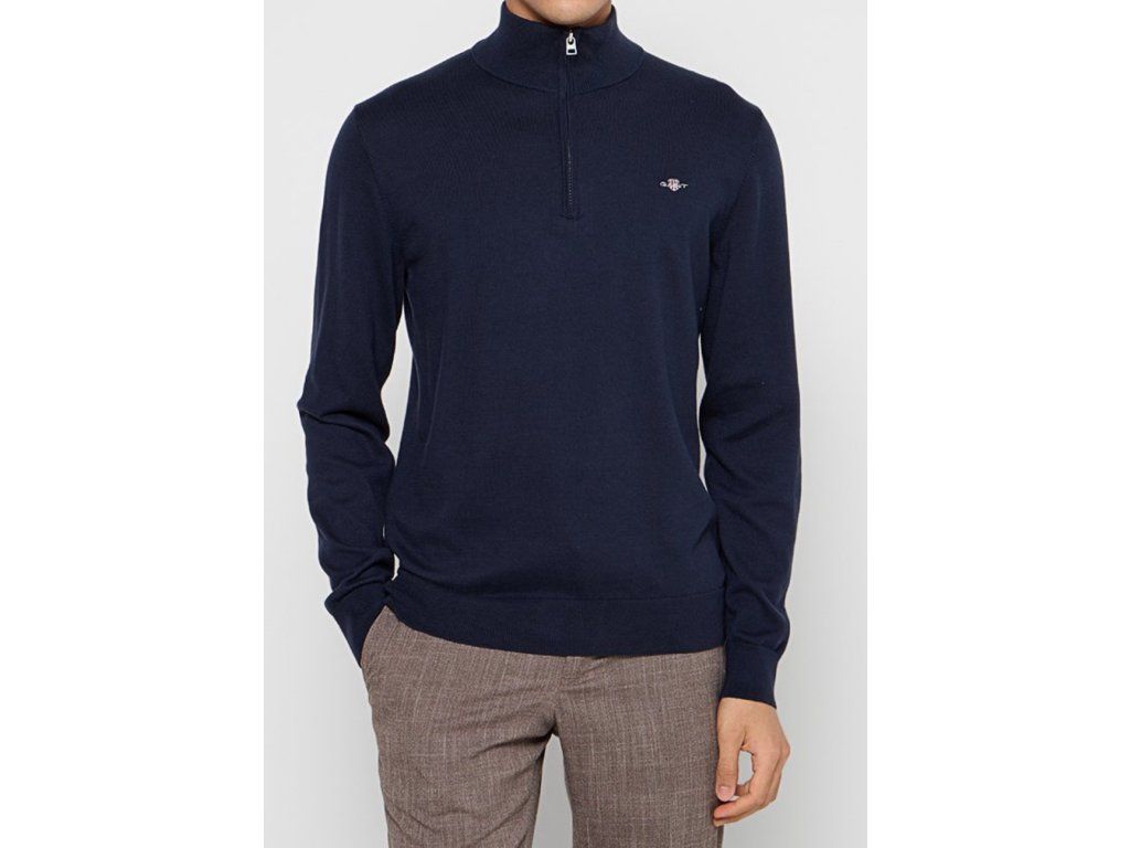 Modrý (marine) svetr, malé vyšité logo, half zip. Složení: 100% bavlna. Rozměry:vel. M: šířka 52cm, délka 69cm..