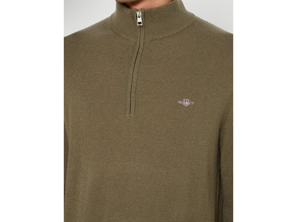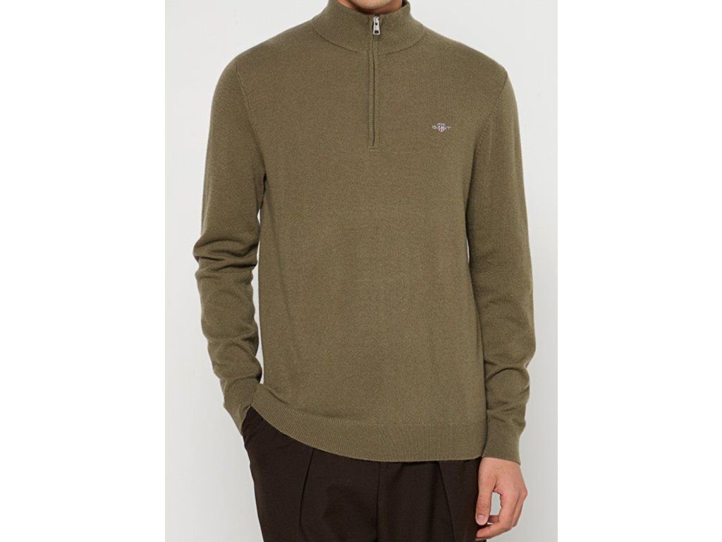 Olivový (juniper green) svetr, malé vyšité logo, half zip. Složení: 80% jehněčí vlna, 20% polyamid.