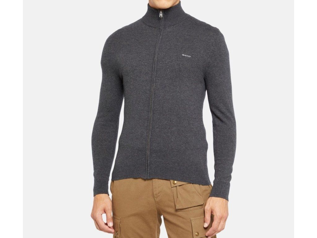 Šedý (dark charcoal melange) svetr, malé vyšité logo, full zip. Složení: 80% extrafine jehněčí vlna, 10% polyamid, 10% bavlna.