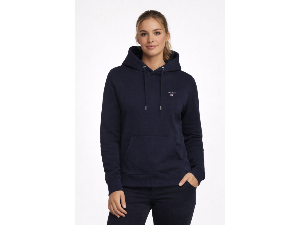 Tmavě modrá mikina s kapucí, s klokankou, vyšité logo.. Mikina je větší, berte o velikost menší, než jste zvyklý.
