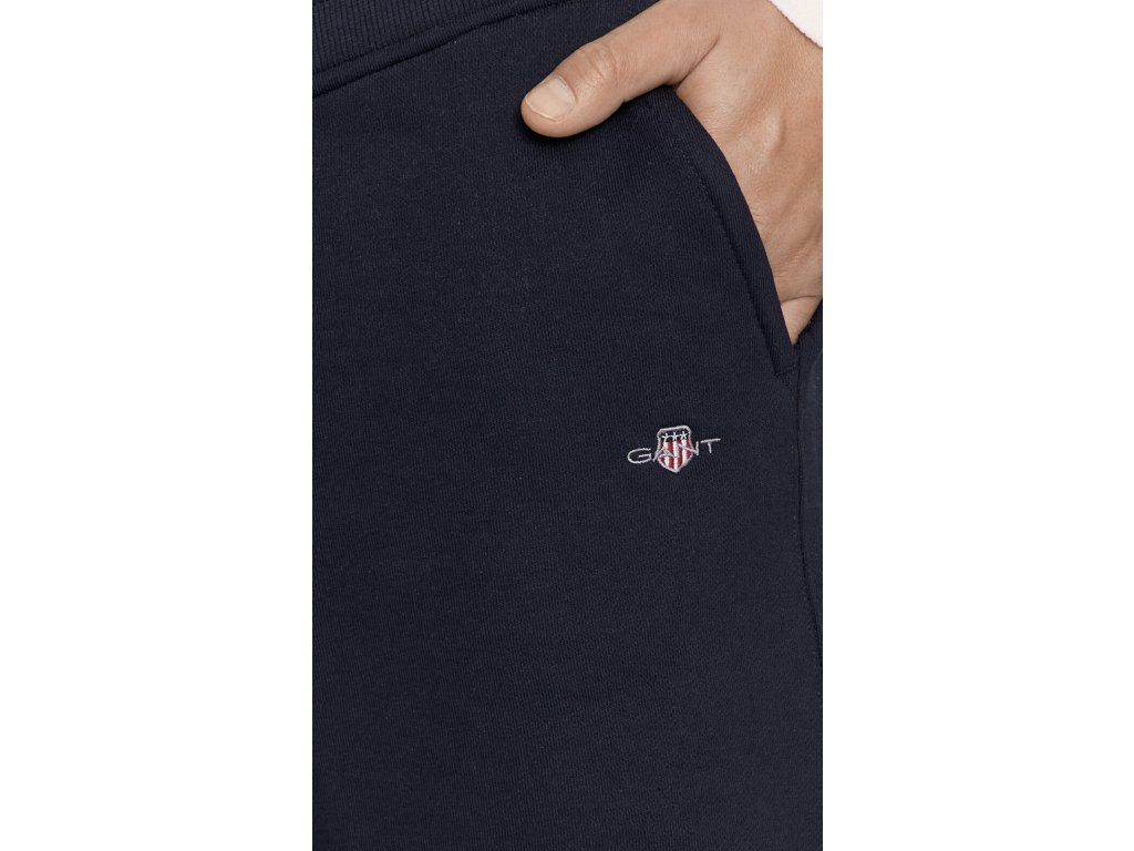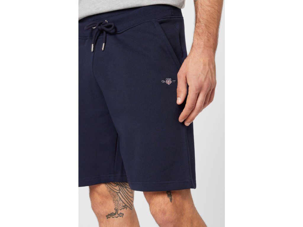 Pánské teplákové kraťase GANT, tmavě modrá barva, vyšité logo. Dvě postranní kapsy. Jedna kapsa vzadu. Silná guma v pase.